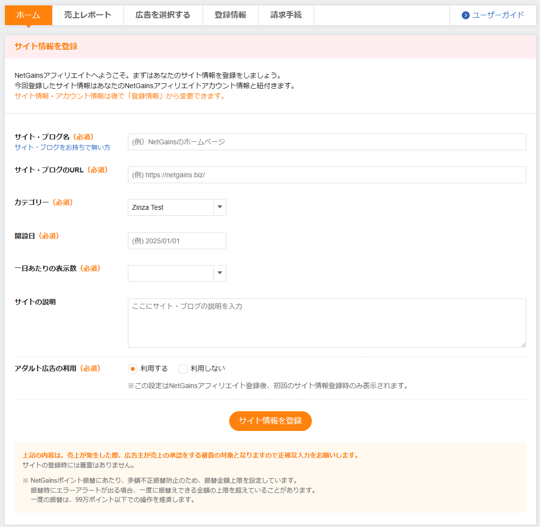 スマートフォン版を表示 »NetGainsアフィリエイトへアフィリエイターとしてご登録が完了しますと、サイト情報登録画面が表示されます。