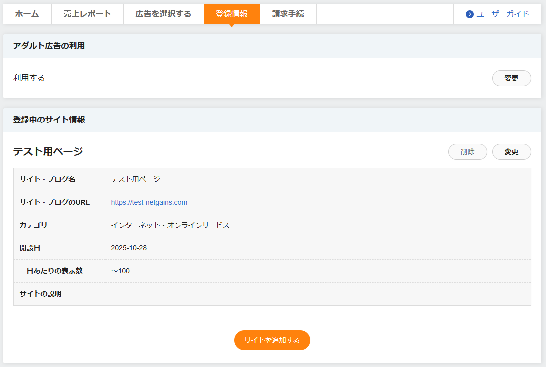 NetGainsアフィリエイトに登録したサイト情報を削除する場合は、ユーザー管理画面メニューの「登録情報」を表示してください。