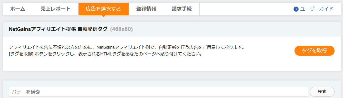 掲載(紹介)したい広告のタグを取得するには、NetGainsアフィリエイトへログインしていただき、