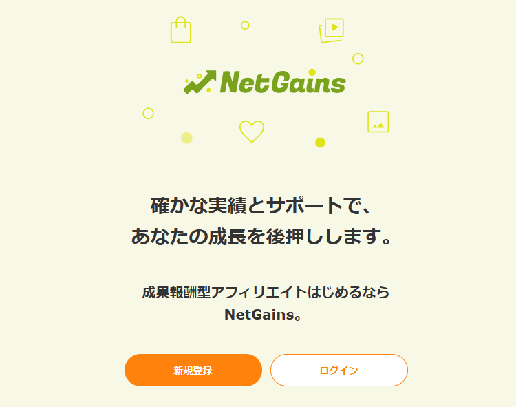 Netgains へアクセスして「新規登録」ボタンをクリックしてください。