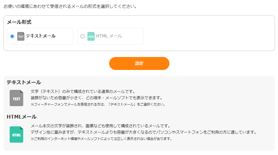 テキストメール、HTMLメールどちらかを選択し、「設定」ボタンをクリックしてください。