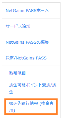 NetGainsPASS管理画面の、左メニュー内の「決済/NetGainsポイント」から、「振込先銀行情報(換金専用)」画面を開いてください。