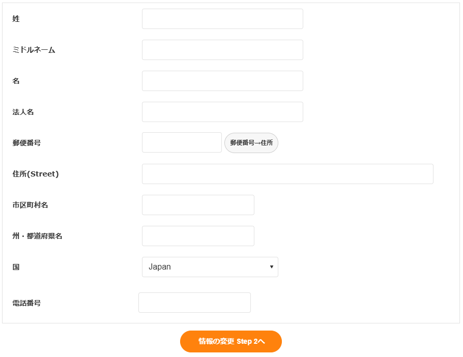 「受取先情報」欄に必要な情報を半角英数で入力し、「情報の変更 Step 2へ」のボタンをクリックしてください。