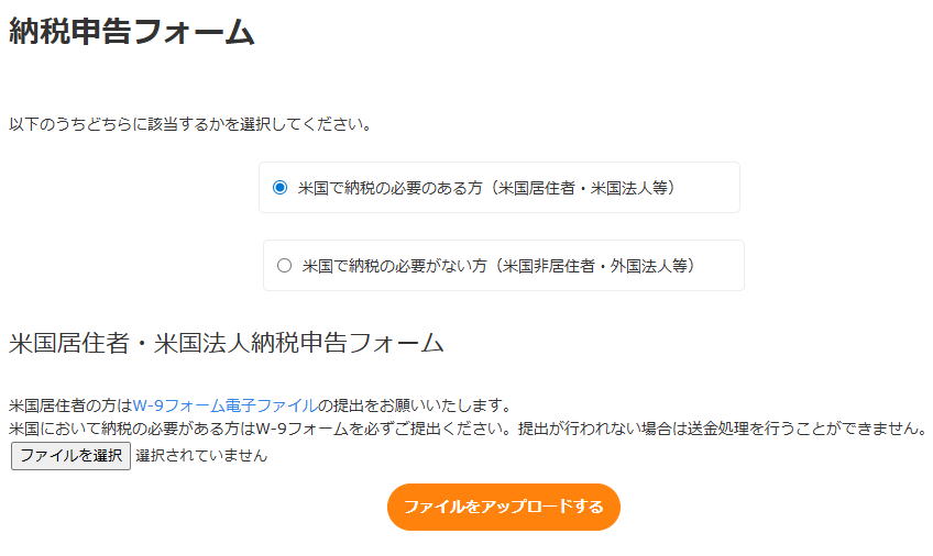 ■米国において納税の必要のある方(定義は内国歳入庁サイト)は、「米国で納税の必要のある方」を選択しW-9をPDFファイルで