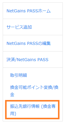 NetGainsPASS管理画面の、左メニュー内の「決済/NetGainsポイント」から、「換金可能ポイント変換/換金」画面を開いてください。