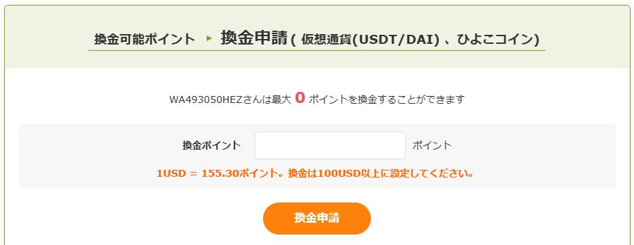 「振替/換金を行う」の項目に、換金したいポイント数をご入力し、「換金申請」ボタンから、換金申請を行ってください。