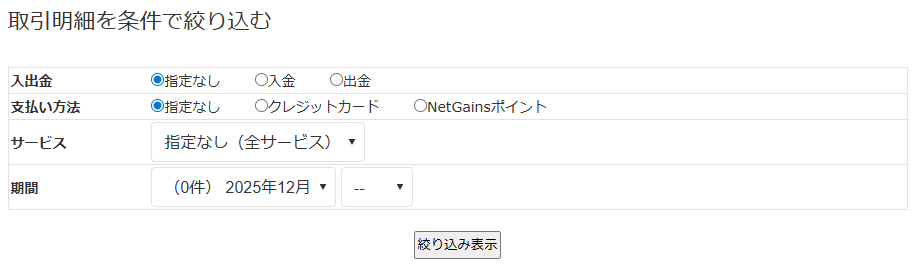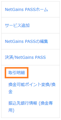 NetGainsPASS管理画面の、左メニュー内の「決済/NetGainsポイント」から、「取引明細」画面を開いてください。